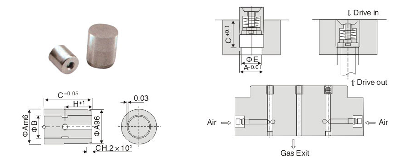 設(shè)計應(yīng)用在熱塑性模具方面, 通過透氣鋼來保證正確功能的使用 。 工作氣壓 / air pressure:1.5~6BARS
