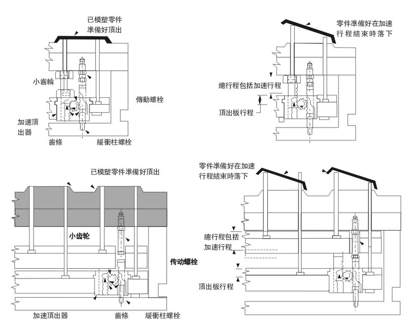 加速頂出器使用一個(gè)齒條一小齒輪結(jié)構(gòu), 以提供多達(dá)5/8英寸的額外頂針行程。它們簡單的直綫移動可以用來增加頂針、頂針?biāo)就不蛘麄€(gè)頂出器組件的速度和行程。 這些裝置上的法蘭和圓角, 使之安裝在頂出器組件裏非常容易 。 穿過齒條部分的長方形可以防止其旋轉(zhuǎn)。 每個(gè)裝置還包括有一個(gè)緩沖柱螺栓。 該螺栓保證齒條在頂出器組件完全返回時(shí)也能肯定地返回。