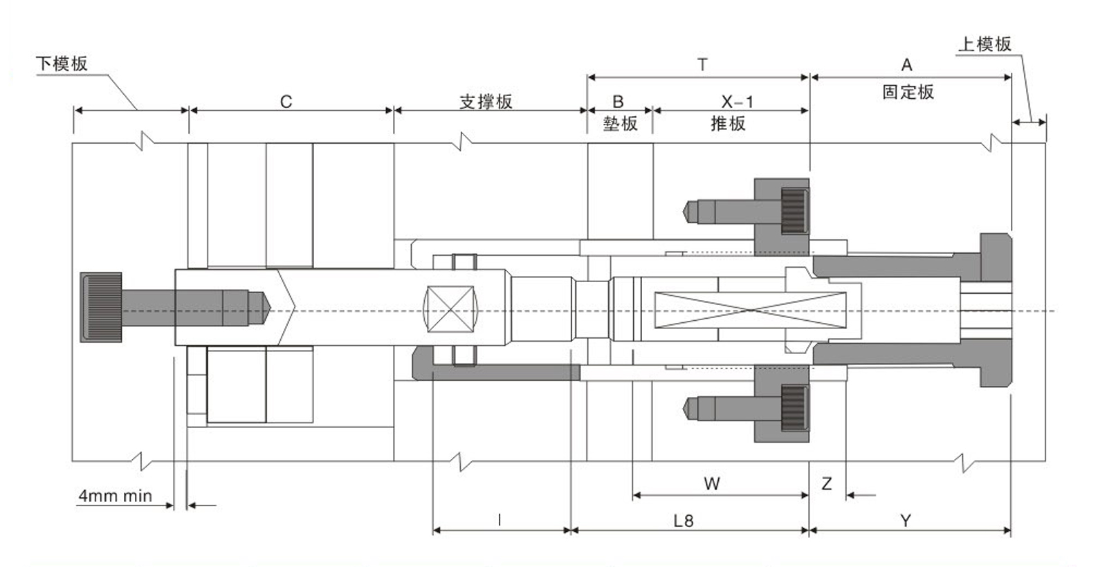 | 插銷 尺寸(¢)  | 型號 | T 行程范圍 Min./Max.  | 中心拉銷 長度配置  | 建議模胚  最大尺寸  | 拉力(kgf) | 尺寸 | ||||