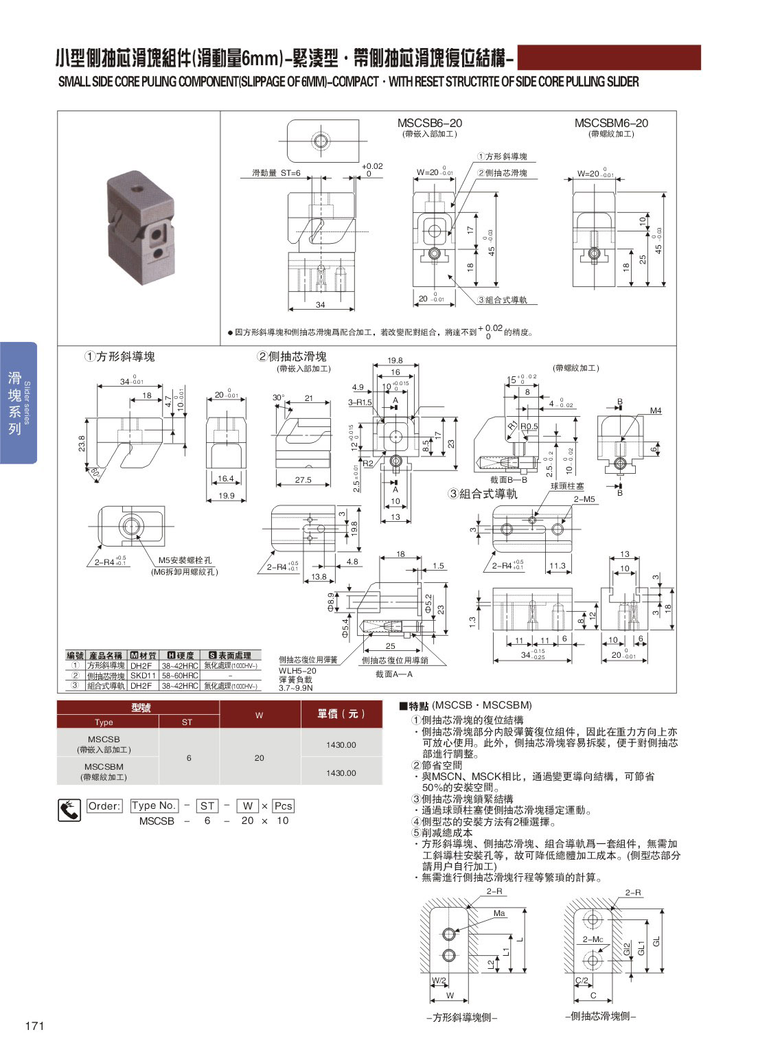 訂購(gòu):171-小型側(cè)抽芯滑塊組件(滑動(dòng)量6mm)-緊湊型˙帶側(cè)抽芯滑塊復(fù)位結(jié)構(gòu) MSCSB