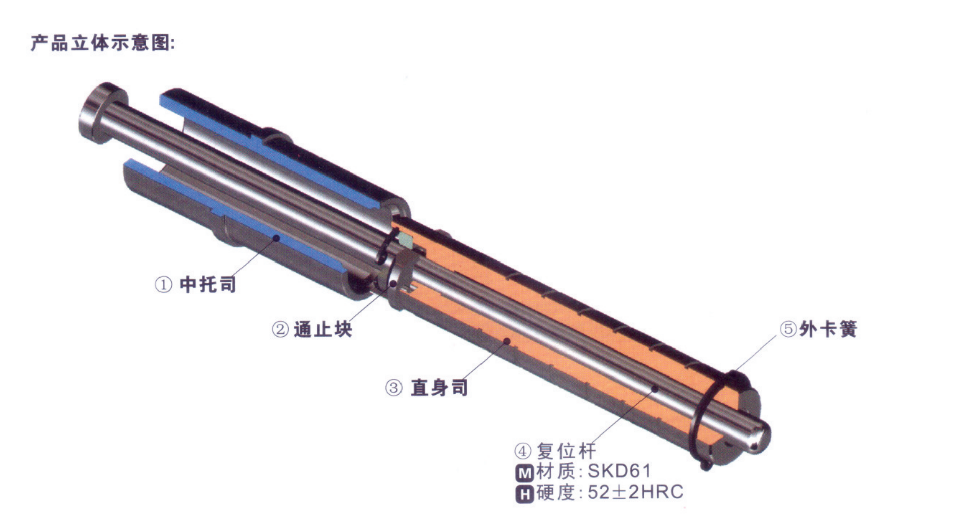 確保復(fù)位推桿準(zhǔn)確裝入直身司的前端部分,請(qǐng)注意如錯(cuò)位將導(dǎo)致模具損壞;