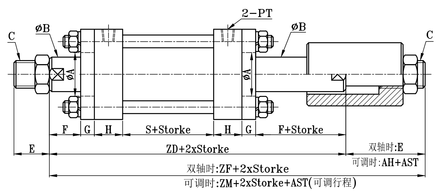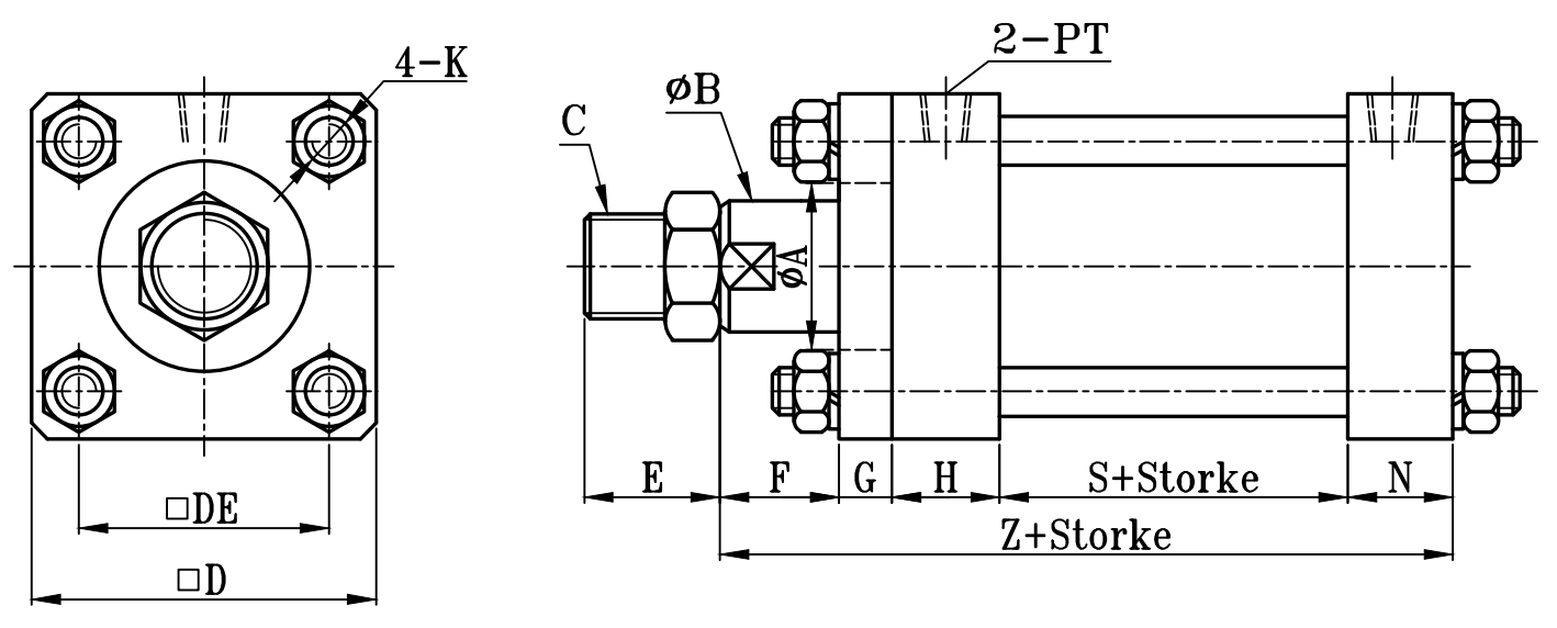 | 缸徑 BORE  | ΦA(chǔ) | ΦB | □ D | □ DE | F | G | H | N | PT | K | S | Z | ZD | ZF | ZM | AH | C | E | J | JH | W | ΦV |