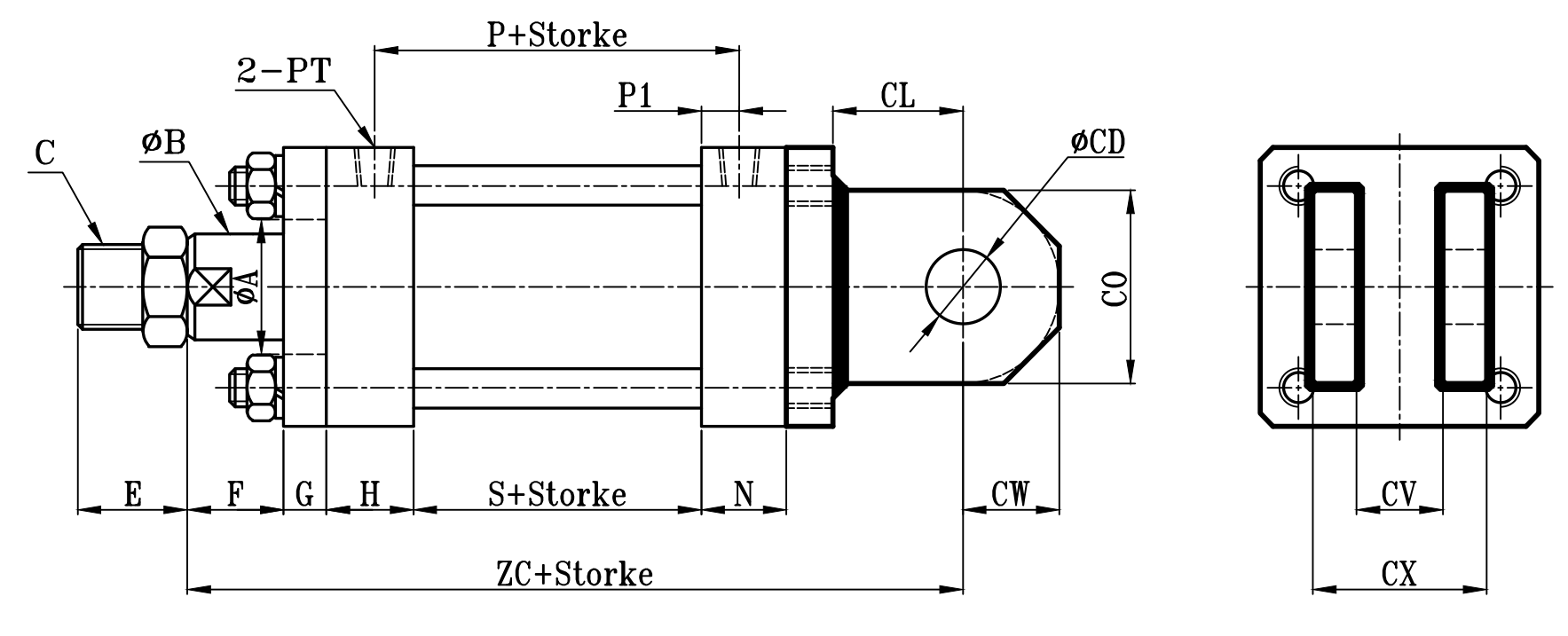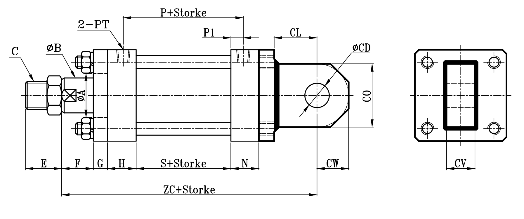 | 缸徑 BORE  | ΦA(chǔ) | ΦB | C | E | F | G | H | N | P | P1 | PT | S | ZC | CL | CW | ΦCD | CO | CV | CX |