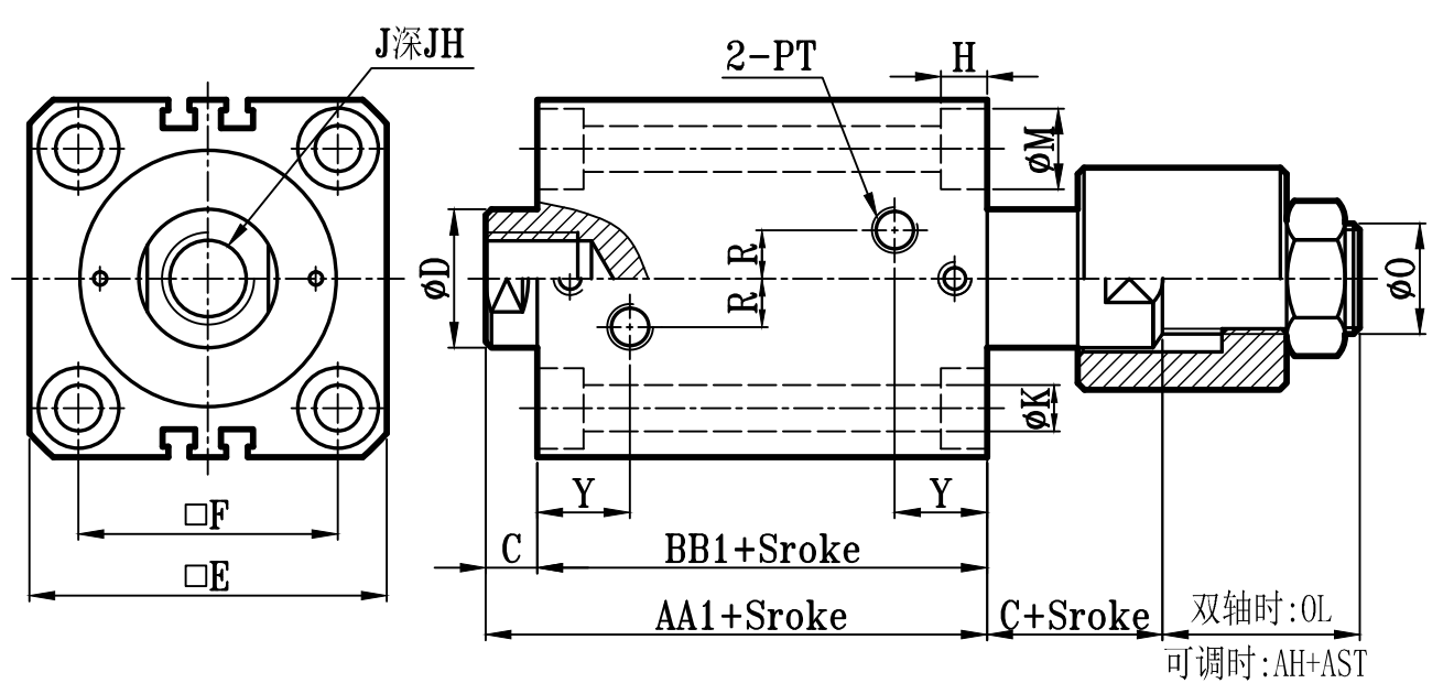 | 缸徑 BORE  | AA1 | BB1 | C | ΦD | EA | FA | EB | LH | Q | FB | ΦK1 | KA | R1 | KW | E | F | ΦK | ΦM | H | R | Y | PT | AH | J | JH | 0 | OL | W | ΦV |