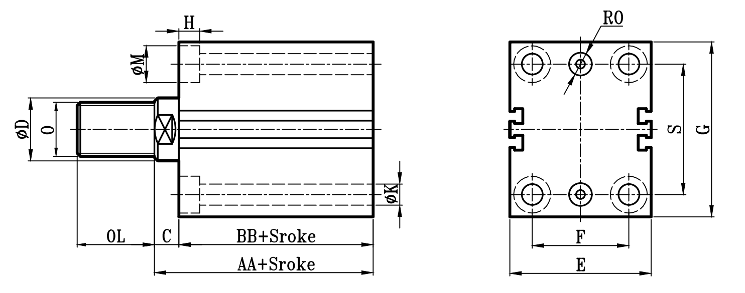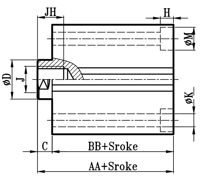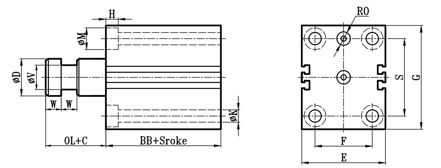 | 缸徑 BORE  | AA | BB | C | ΦD | E | F | S | G | ΦK | ΦM | H | R0 | J | JH | 0 | 0L | W | ΦV |