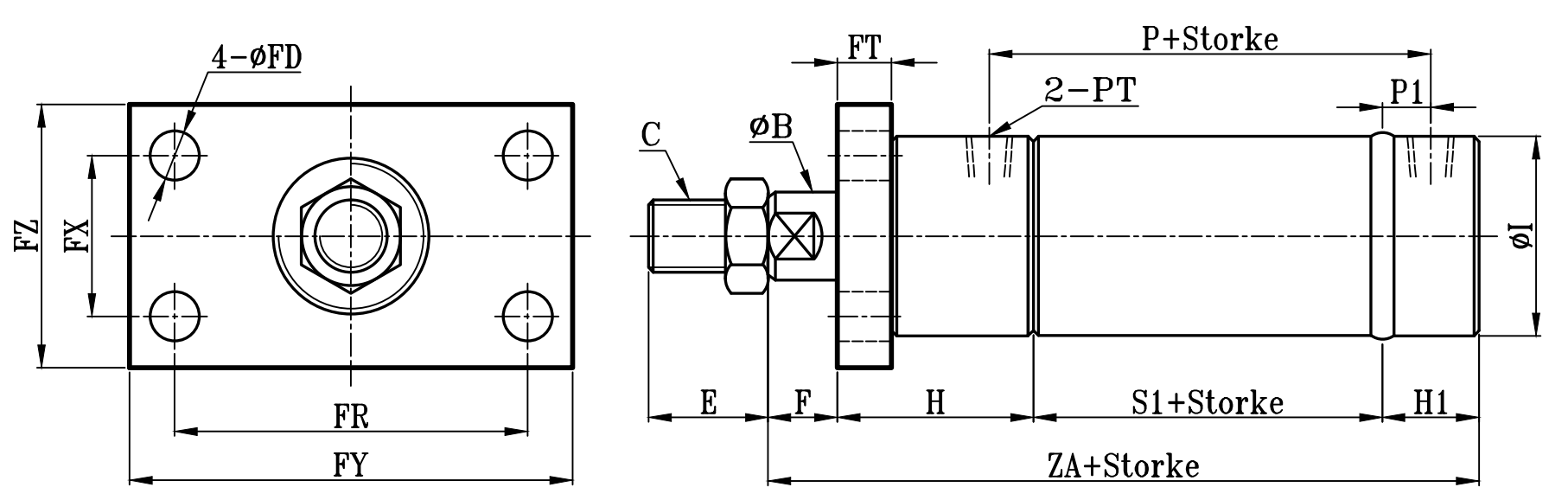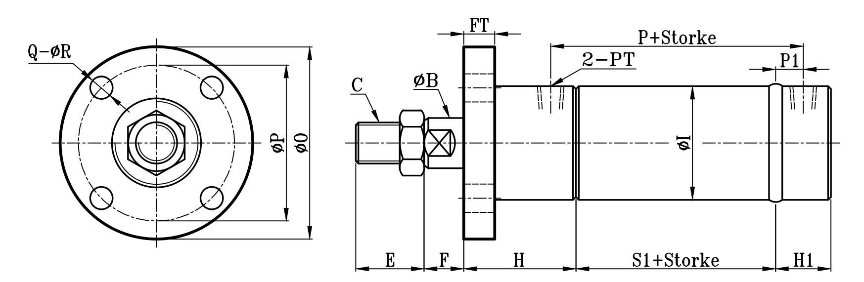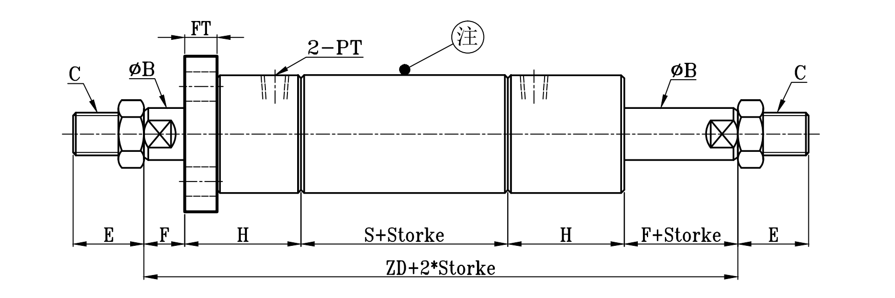 | 缸徑 BORE  | ΦB | C | E | F | H1 | H | ΦI | P | P1 | PT | S1 | S | ZA | ZD | FT | ΦFD | FR | FX | FY | FZ | Q | ΦR | Φ0 | ΦP |