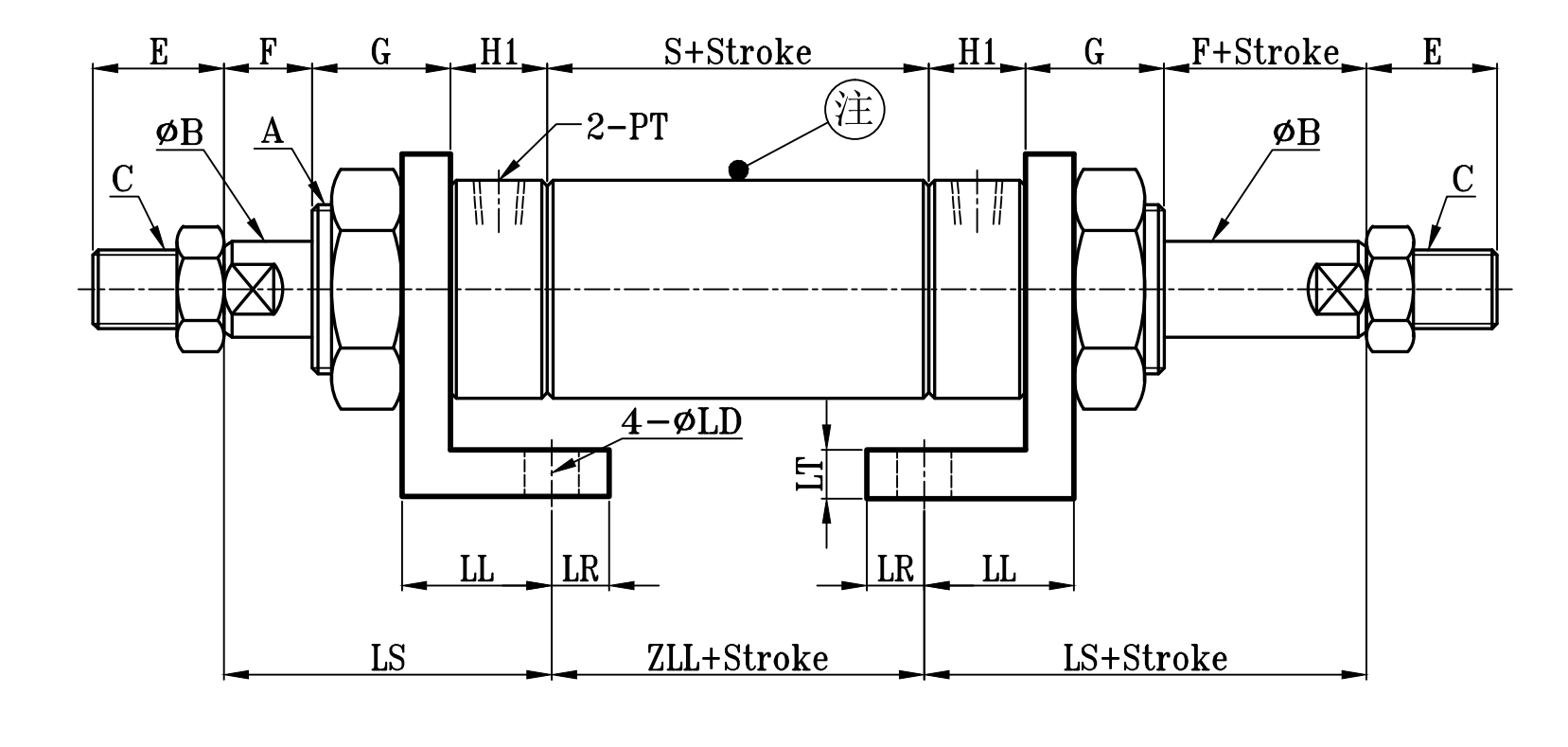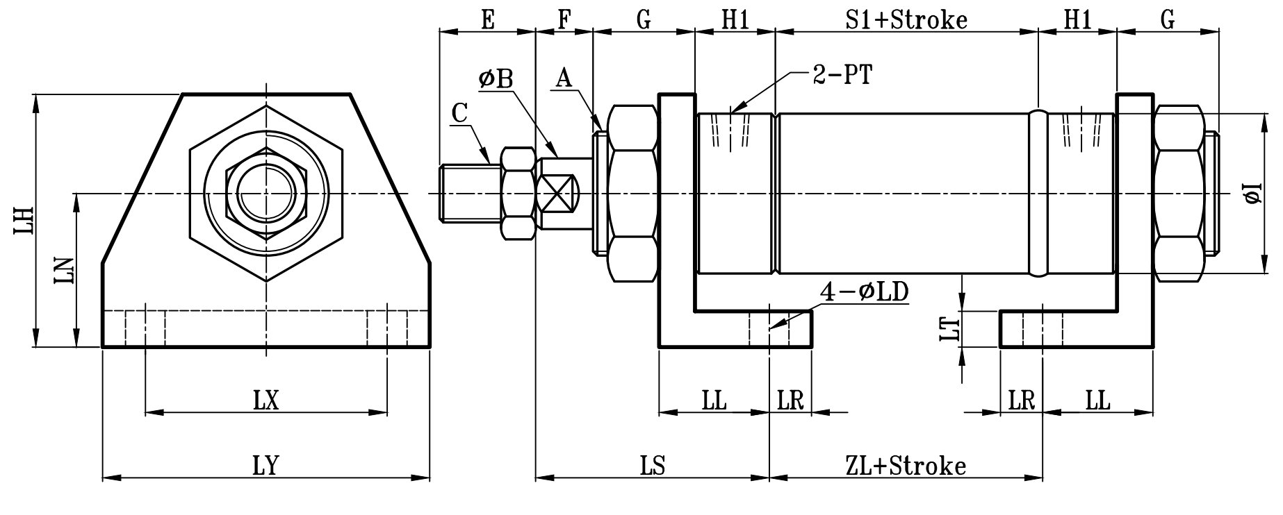 | 缸徑 BORE  | A | ΦB | C | E | F | G | H1 | ΦI | PT | S1 | S | LS | ZL | ZLL | ΦLD | LH | LN | LL | LR | LT | LX | LY |