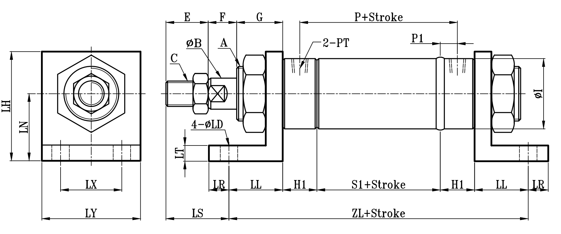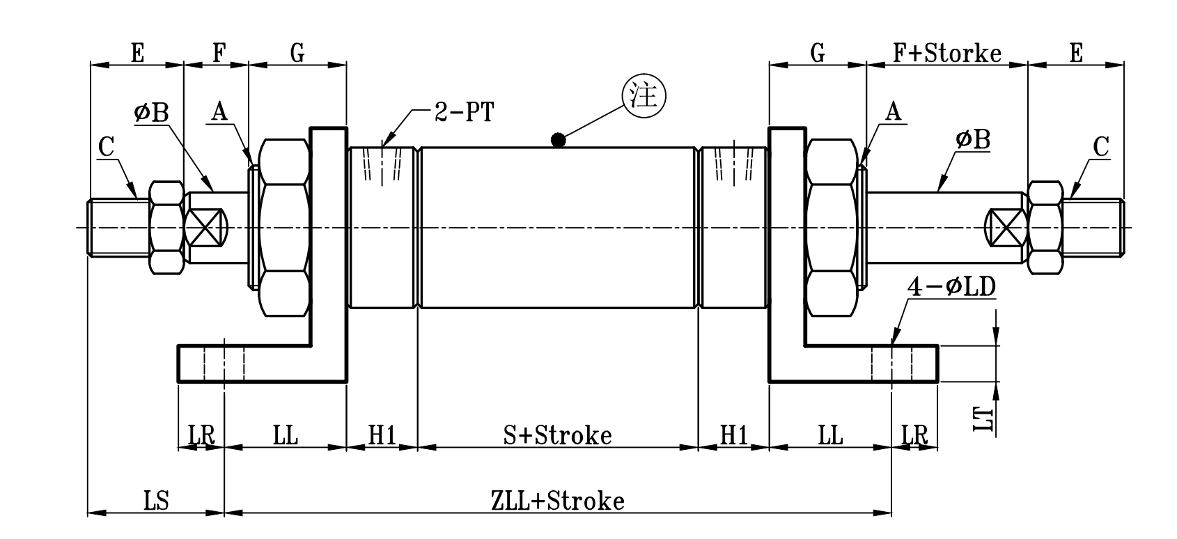 | 缸徑 BORE  | A | ΦB | C | E | F | G | H1 | ΦI | P | P1 | PT | S1 | S | LS | ZL | ZLL | ΦLD | LT | LH | LN | LL | LR | LX | LY |