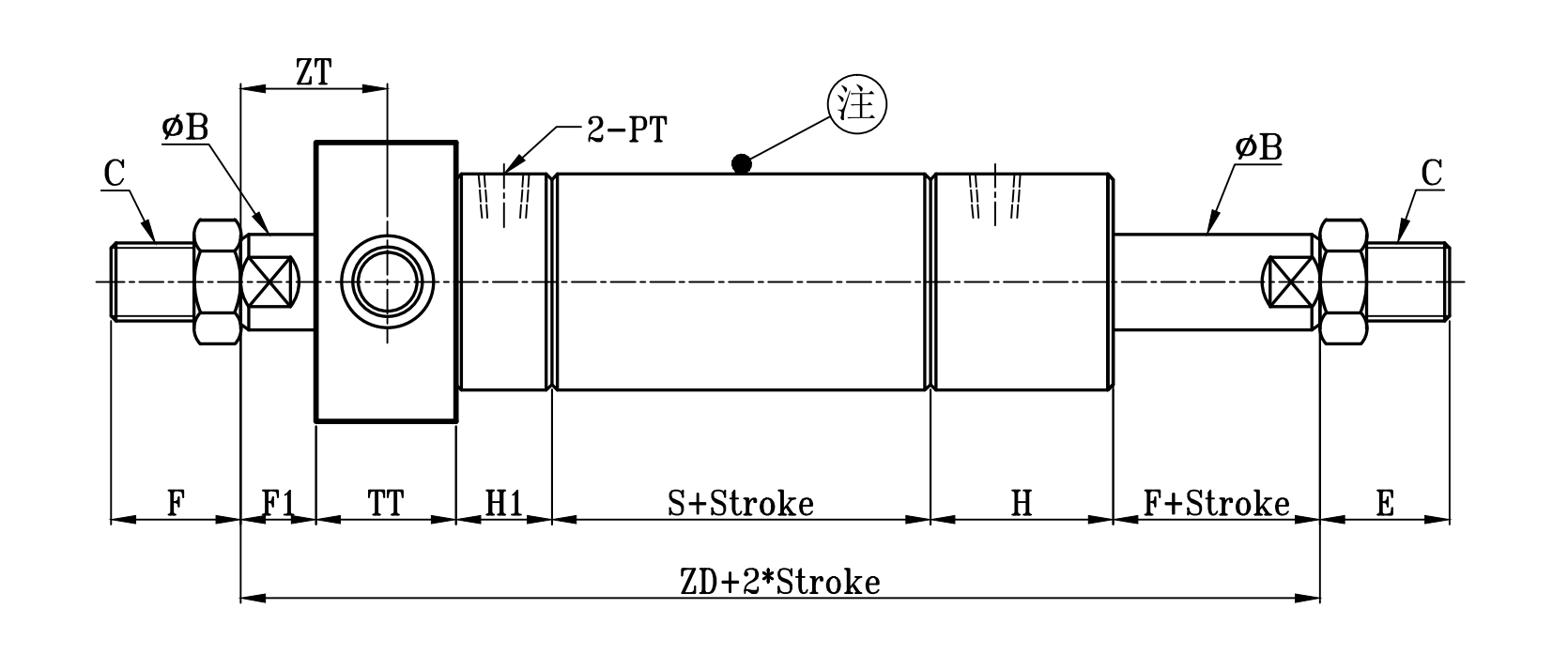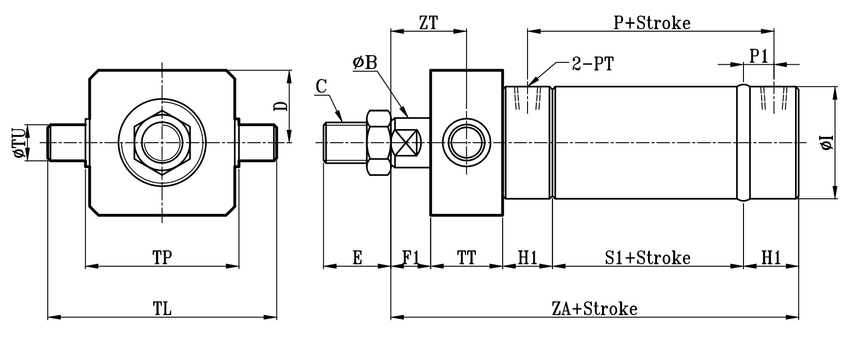| 缸徑 BORE  | ΦB | C | E | F | F1 | H1 | H | ΦI | P | P1 | PT | S1 | S | ZA | ZD | ZT | ΦTU | TL | TP | TT | D |