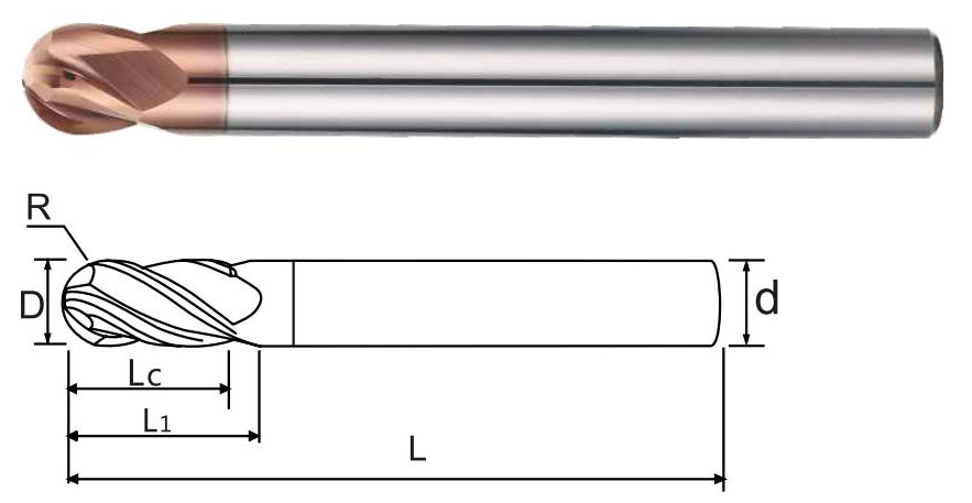 | 商品編號(hào) Product number | 半徑(R) Radius of R | 刃徑(D) Blade diameter | 刃長(zhǎng)(Lc) Blade length | 有效長(zhǎng)(L1) Effective long | 柄徑(d) Shank diameter | 全長(zhǎng)(L) Overall length | 刃數(shù) Flute |