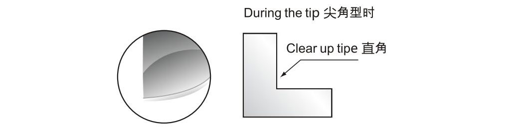 ![]() | Use for clear up tipe.工作直角進(jìn)使用。 Sharp tip,easy to break.尖角部鋒利,但易崩刀。 Can be use in carbone steel and steel,specially using in Aluminum and non-ferrous material .碳素鋼和調(diào)質(zhì)鋼也能使用,尤其廣泛應(yīng)用于鋁材等非鐵材質(zhì)的加工,對(duì)于高硬度的工作,因崩刀而無法適用。 |